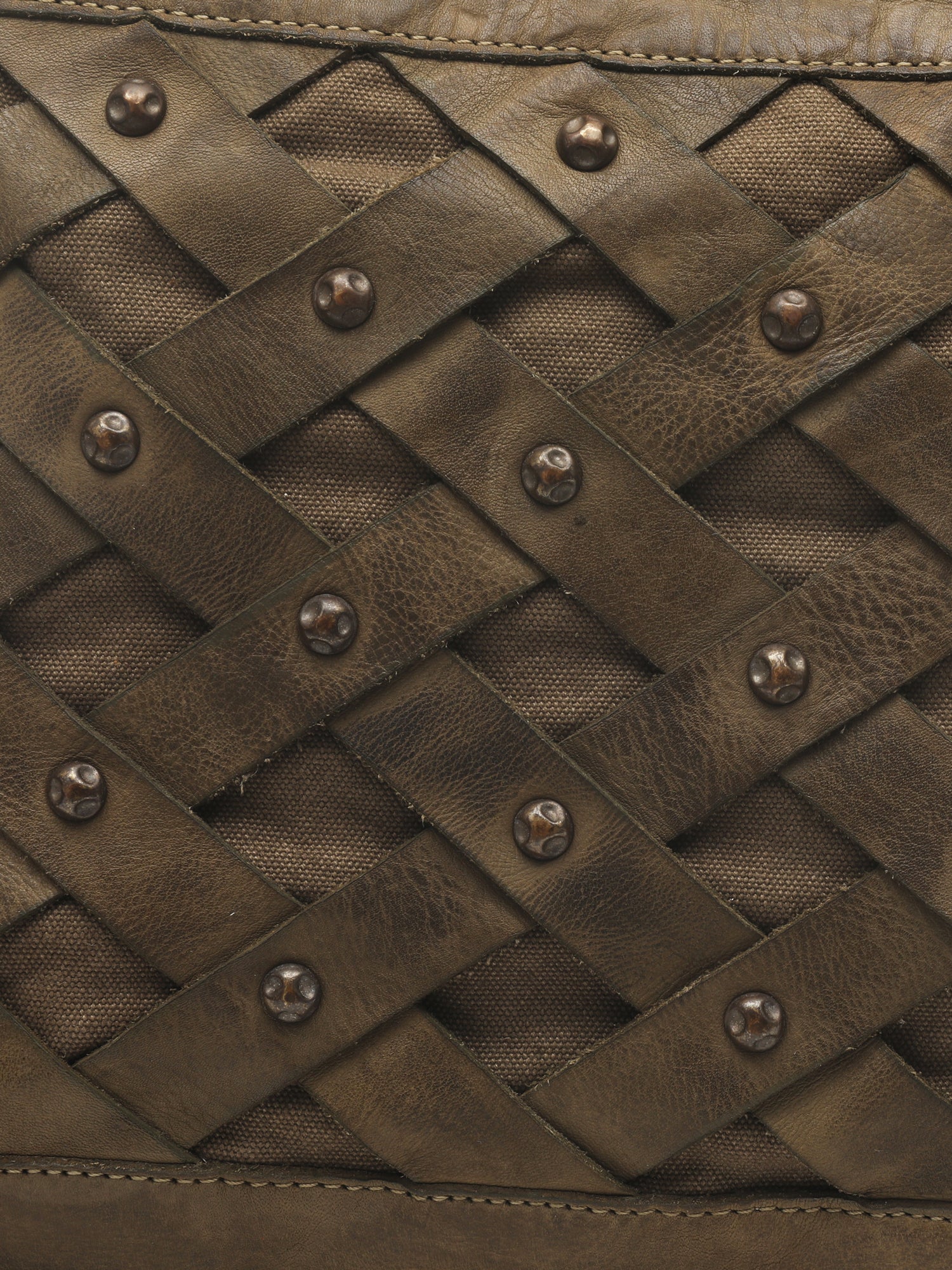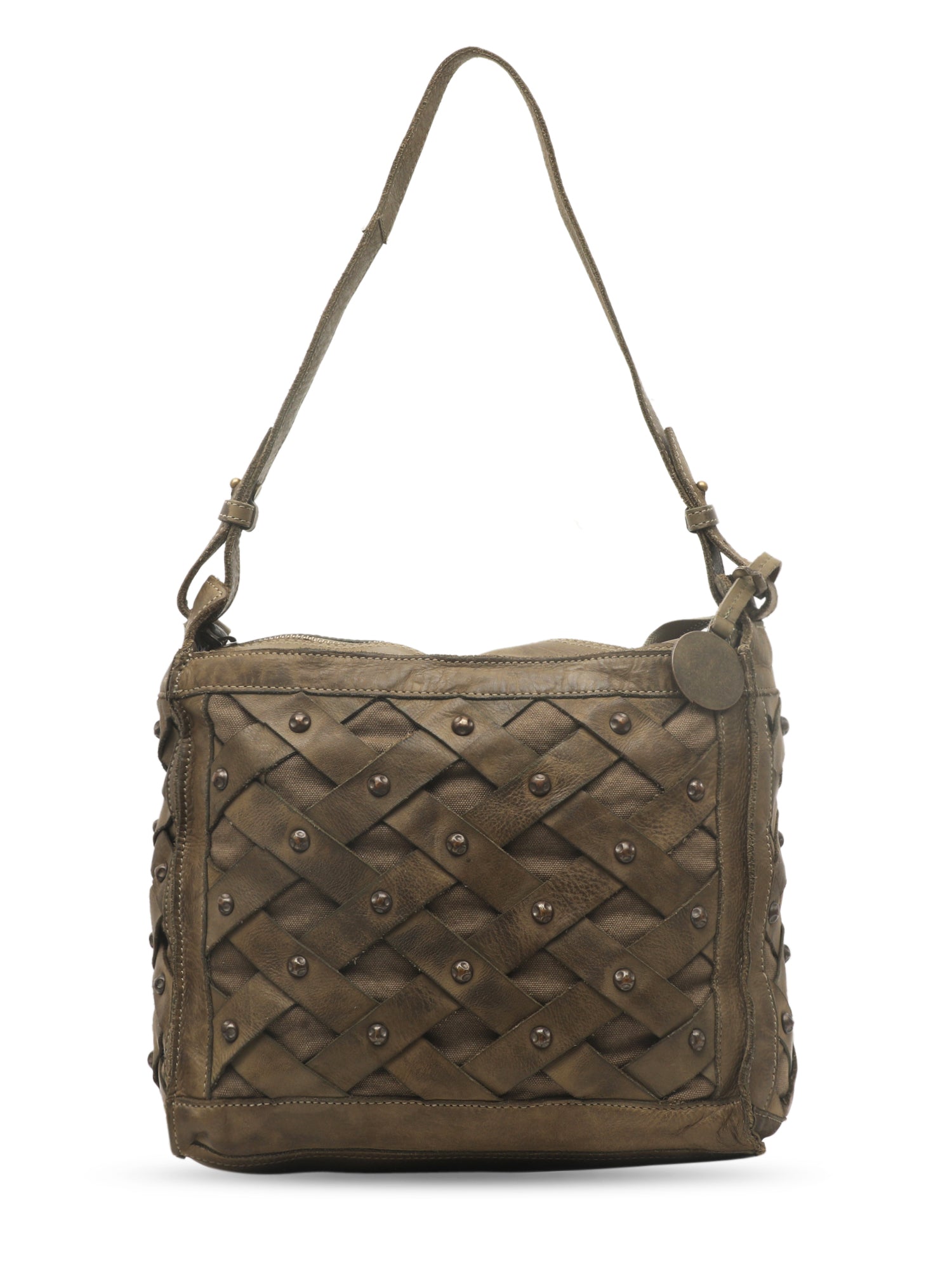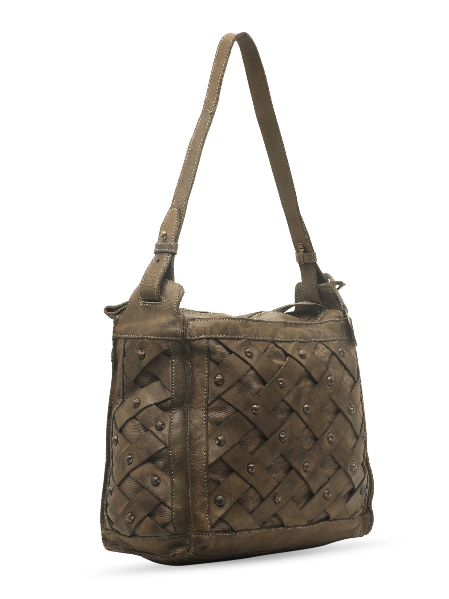 LILY axelväska i vackert vävt fiskbensmönster med matchande nitar, lite nättare än sin storasyster men ändå oväntat rymlig, hon ger din vardag extra glans med sitt vackra hantverk.